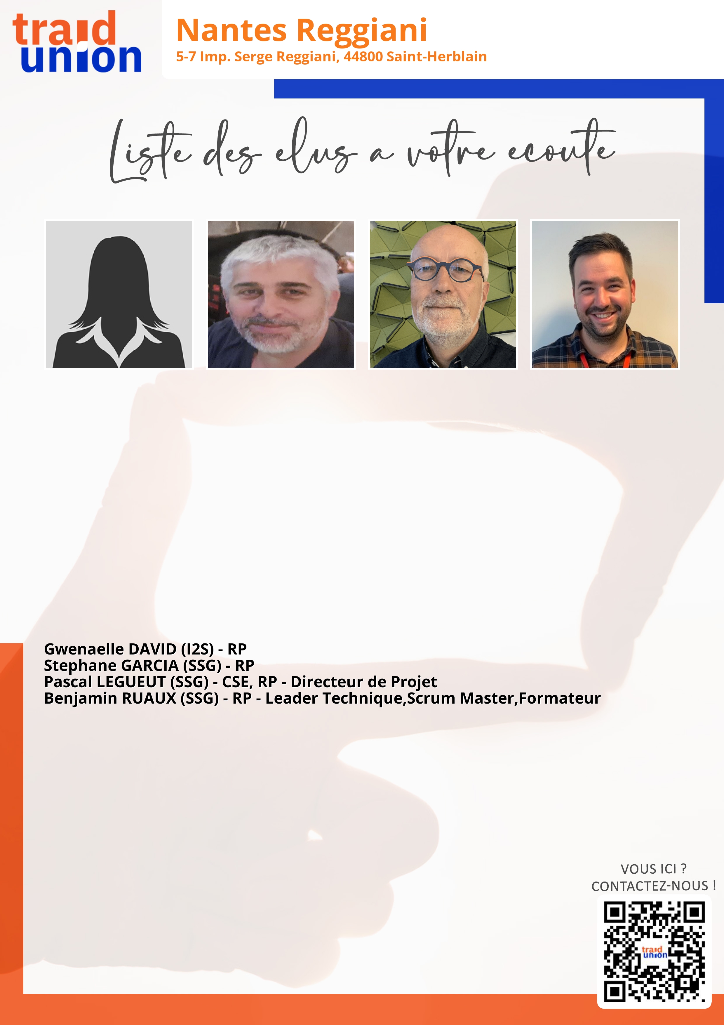 Vos élus à Nantes Reggiani 5-7 Imp. Serge Reggiani, 44800 Saint-Herblain Mme Gwenaelle DAVID (I2S)M. Stephane GARCIA (SSG)M. Pascal LEGUEUT (SSG)M. Benjamin RUAUX (SSG) Imprimer la liste des élus au format A4 (recto) Imprimer la liste des élus au format A4 (verso) Trouver UES Groupe1UES Groupe1