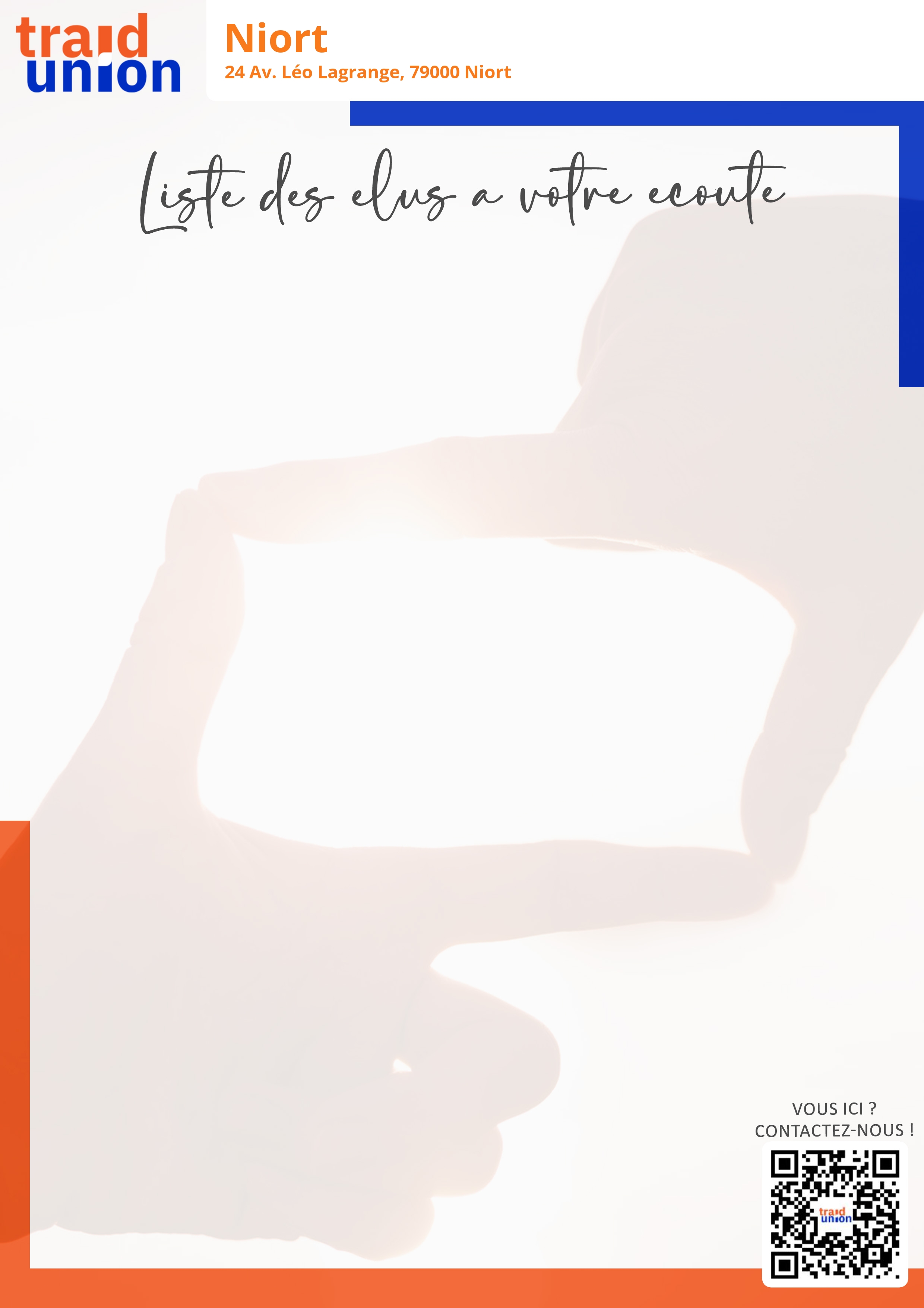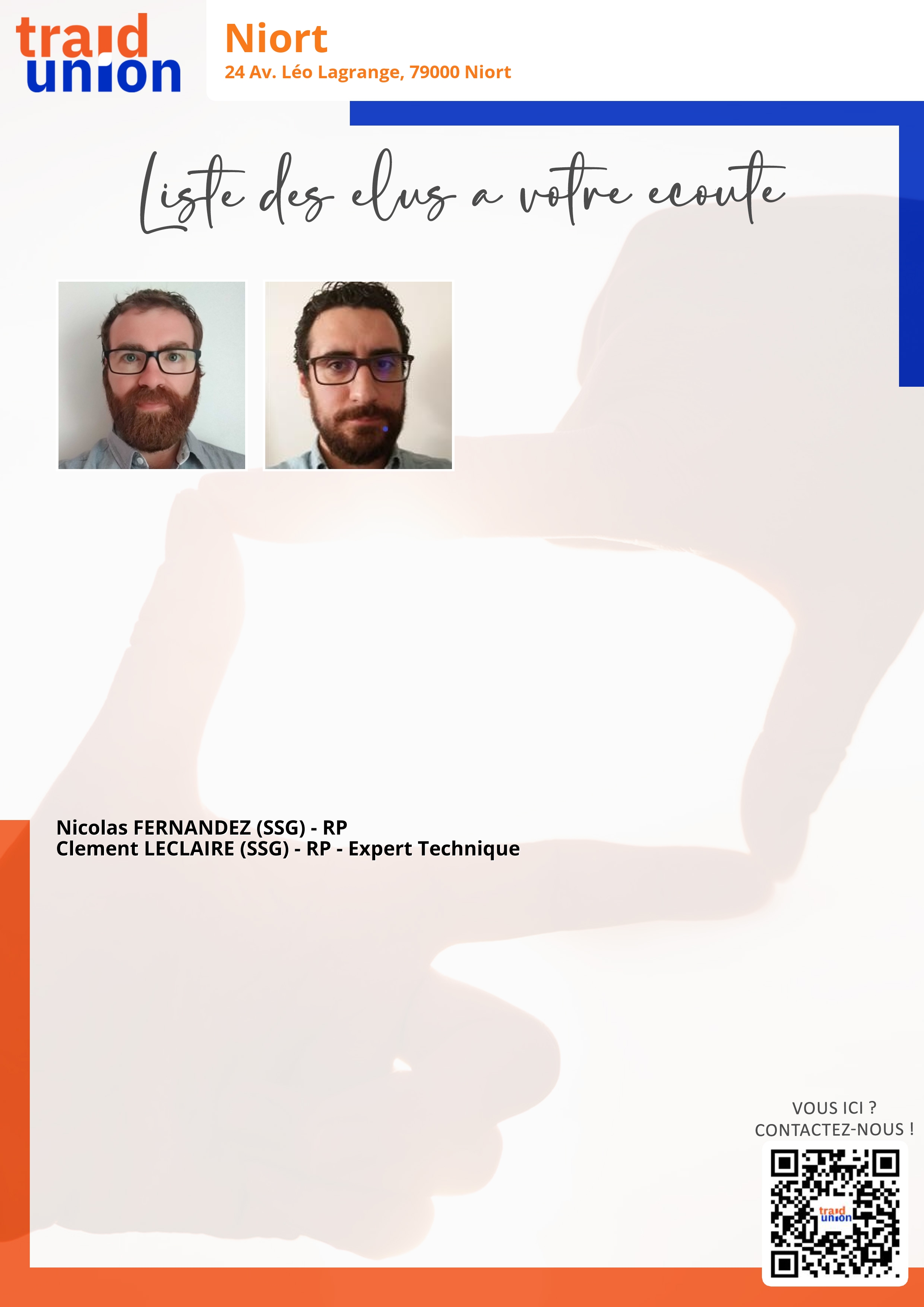 Vos élus à Niort 24 Av. Léo Lagrange, 79000 Niort M. Nicolas FERNANDEZ (SSG)M. Clement LECLAIRE (SSG) Imprimer la liste des élus(recto) Imprimer la liste des élus(verso) [DISPLAY_ULTIMATE_SOCIAL_ICONS] Trouver UES Groupe1UES Groupe1