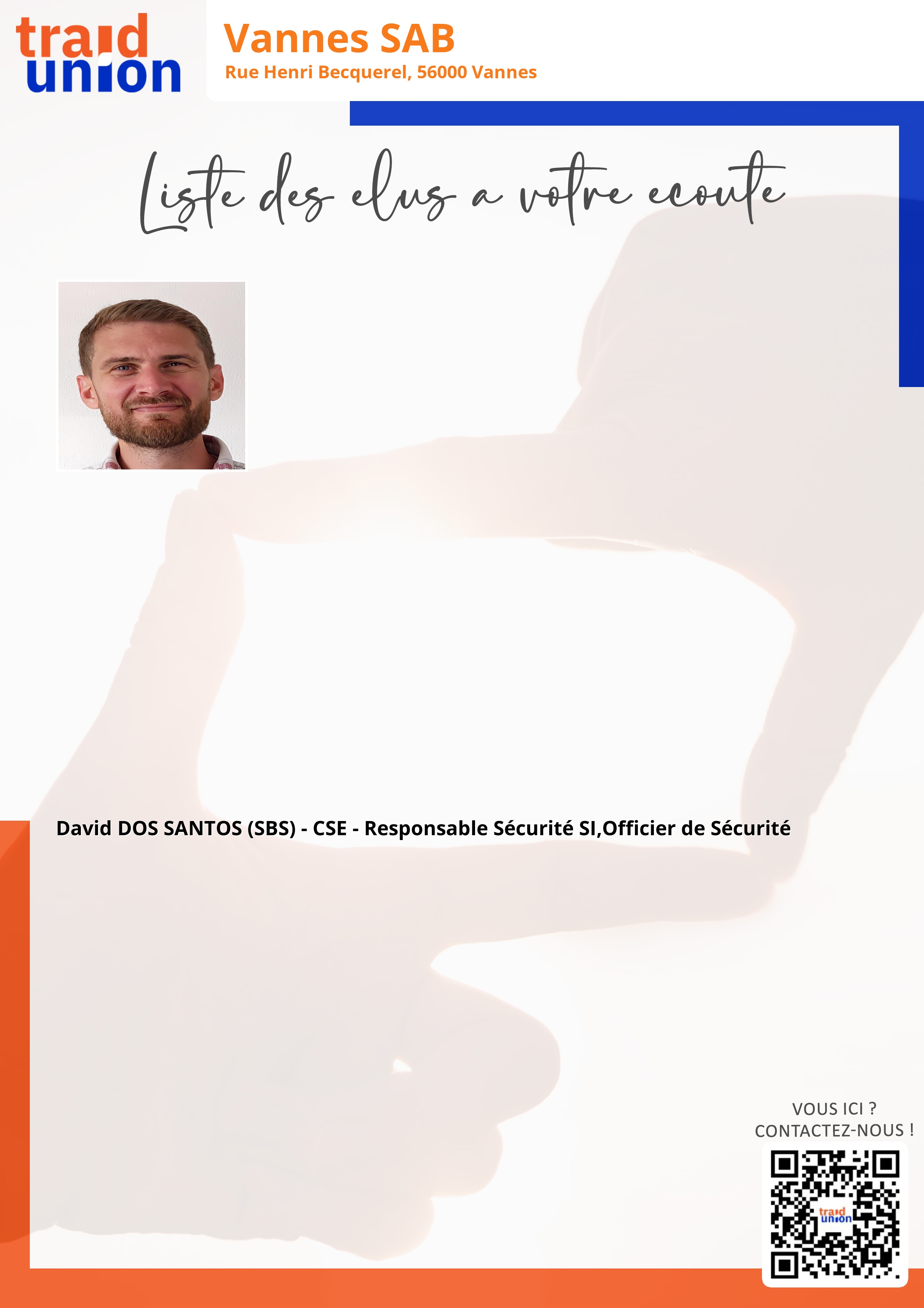 Vos élus à Vannes SAB Rue Henri Becquerel, 56000 Vannes M. David DOS SANTOS (SBS) Imprimer la liste des élus(recto) Imprimer la liste des élus(verso) [DISPLAY_ULTIMATE_SOCIAL_ICONS] Trouver UES Groupe1UES Groupe1